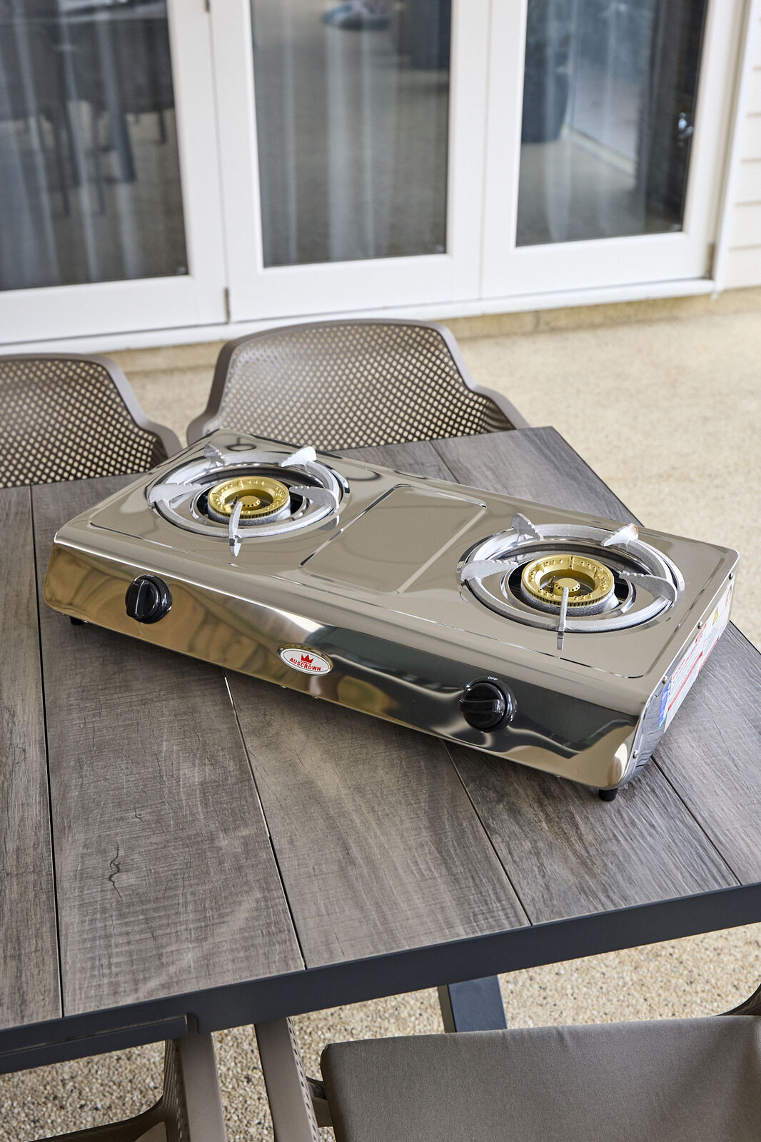 Deluxe 2 Burner with removable brass burner caps & 1.2 m hose and regulator, cast iron trivets, flame failure safety device, for indoor and alfresco kitchen use